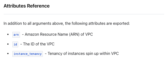 생성한 resource의 속성 값들이다. terraform registry 문서를 보면 resource 문서들은 Argument Reference와 Attribute Reference로 이루어져 있다.